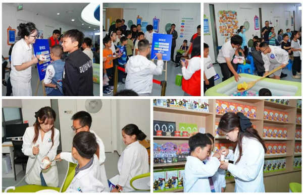 在游戏互动区域,丰富有趣的体验项目全天滚动开放,成为赛事里的“温馨补给站”:棋手与家长可共同参与“幸运牙牙乐”“投投乐”“看图猜成语” 等亲子游戏;更有深受喜爱的“小牙医”体验活动,孩子们能穿上专业“装备”,沉浸式解锁护牙新技能。