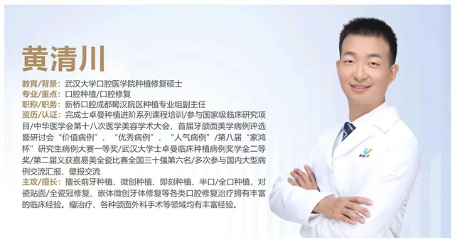 新桥口腔成都蜀汉院区种植专业组副主任/口腔修复学硕士黄清川友情提示:种植牙术后的恢复期,是确保手术成功和种植牙长期使用的关键时期。在此期间,患者应严格遵守医生的饮食建议,并保持良好的口腔卫生习惯,定期复诊检查,以确保种植牙的稳定性和使用效果。